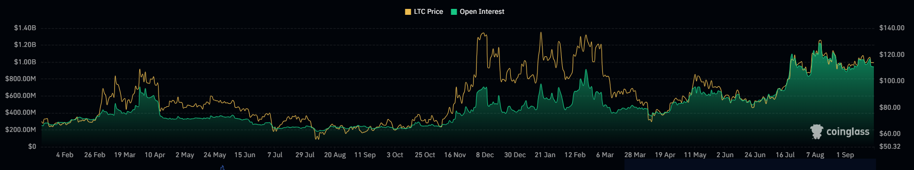 Di pasar derivatif, dinamika yang terjadi juga memperlihatkan pergeseran signifikan. Berdasarkan data CoinGlass, volume perdagangan Litecoin melonjak 184,81 persen menjadi US$1,35 miliar.