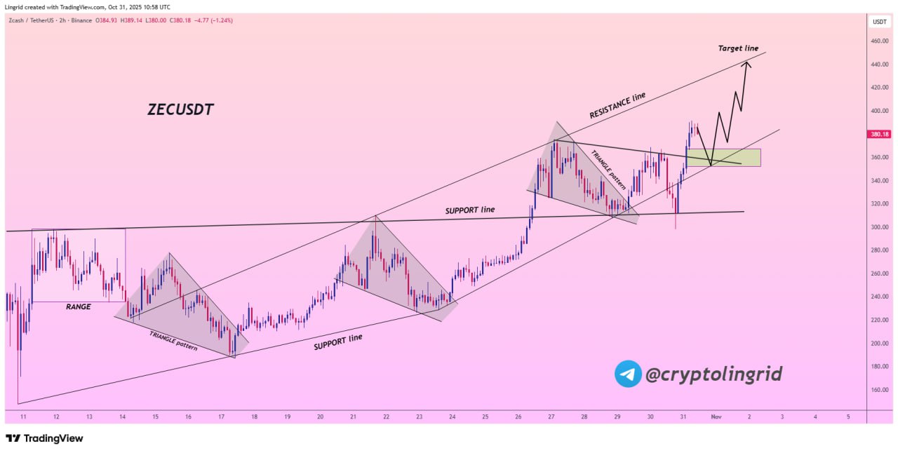 Berdasarkan analisis terbaru dari analis popular Lingrid, harga Zcash (ZEC) saat ini bertahan di atas garis support menanjak dan berfluktuasi dalam kisaran US$352–US$365, area yang sebelumnya menjadi zona supply dan kini berubah menjadi zona demand.