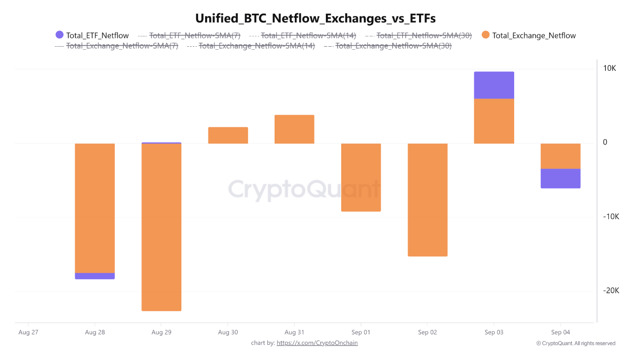 Namun, situasi berbeda terjadi pada 3 September ketika tercatat inflow cukup besar ke Exchange Traded-Fund (ETF) berbasis Bitcoin. Lonjakan permintaan institusional ini hanya berlangsung singkat karena sehari kemudian, 4 September, arus dana kembali berbalik keluar.