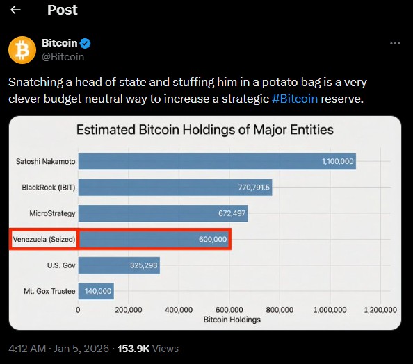 Bahkan akun X Bitcoin mengunggah pernyataan terkait itu, menyebut bahwa dugaan penyitaan Bitcoin Venezuela sebanyak itu menjadi cara yang cerdik untuk menambah cadangan BTC bagi sebuah negara.