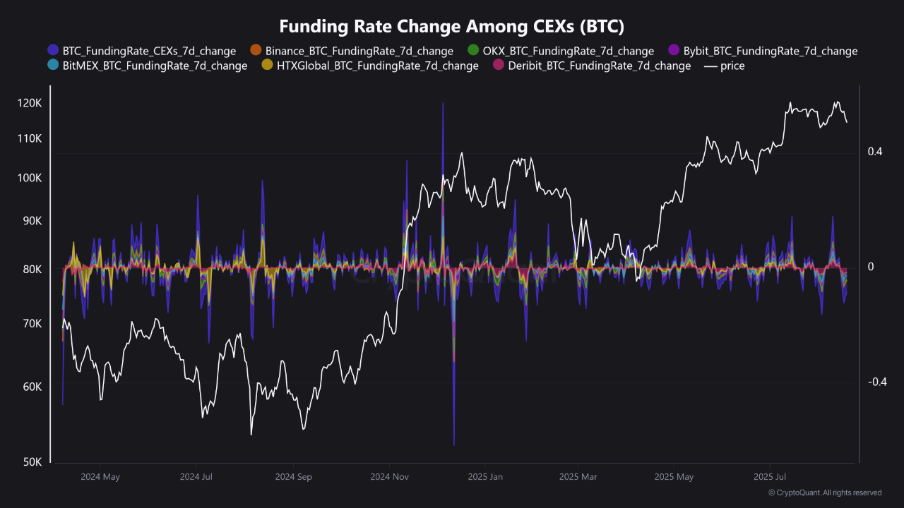 Selain itu, dalam pengamatan selama tujuh hari, funding rate change Binance juga paling kecil secara rata-rata absolut. Hal ini menunjukkan bahwa pasar perpetual BTC di Binance tidak rentan terhadap pergeseran sentimen yang tiba-tiba dan ekstrem, mencerminkan kematangan serta likuiditas tinggi dari bursa tersebut.