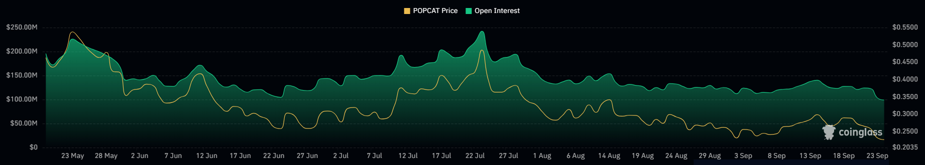 Meski pola teknikal menunjukkan peluang bullish, kondisi pasar masih memberikan tekanan bagi memecoin POPCAT. Data CoinGlass mencatat volume perdagangan derivatif melonjak 11,38 persen dalam 24 jam terakhir menjadi US$121,96 juta, sementara open interest justru turun 2,25 persen ke level US$100,88 juta.