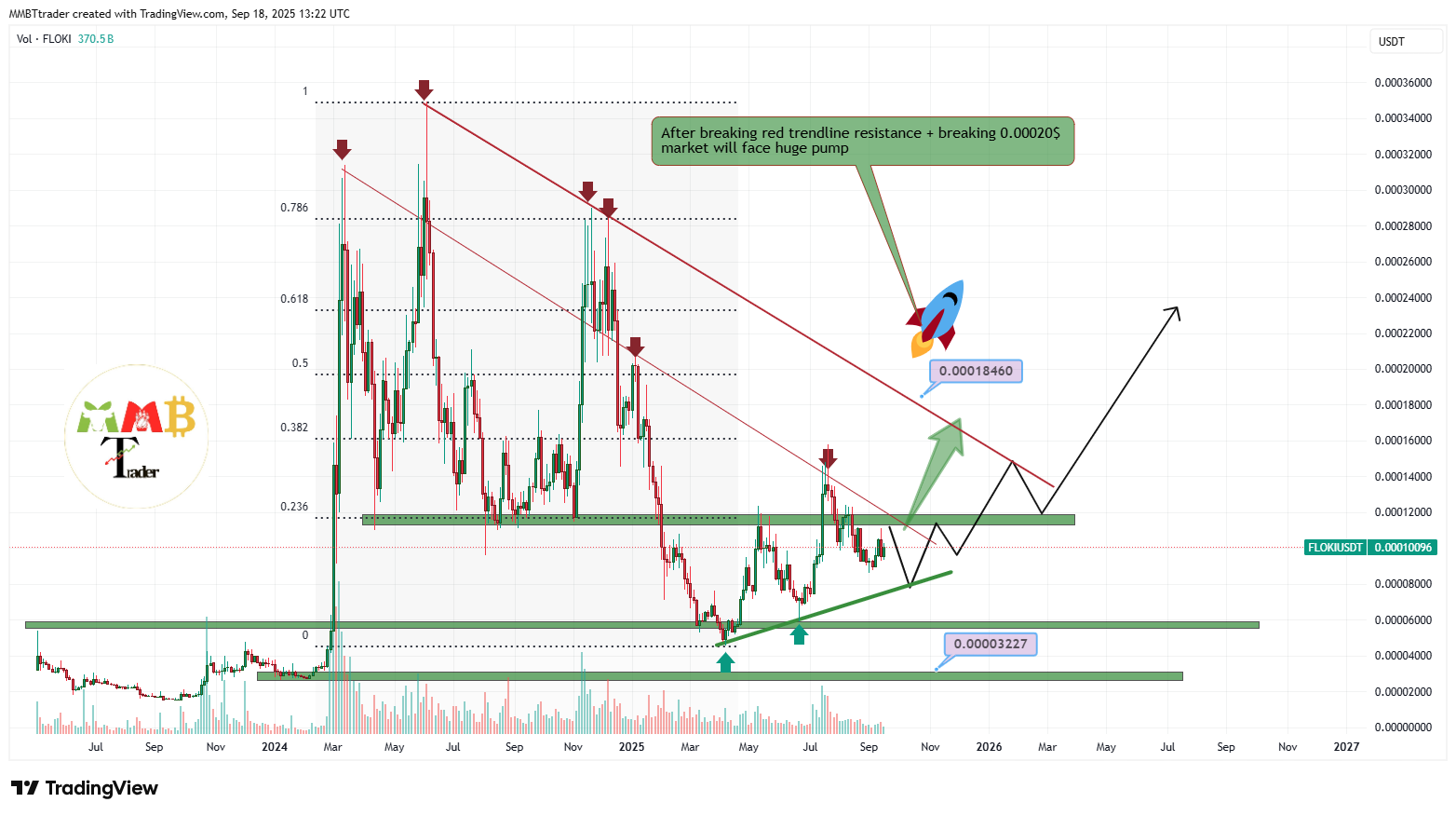 MMBTtrader menilai bahwa FLOKI berpeluang memulai tren bullish lebih agresif apabila mampu menembus garis trendline merah yang selama ini menjadi hambatan utama.