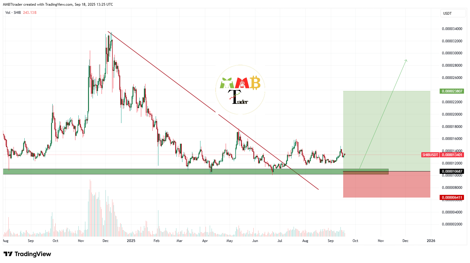 Selain Bitcoin, token Shiba Inu (SHIB) juga menjadi perhatian karena tengah berada di zona support harian dan mingguan US$0,000010. Zona ini disebut sebagai low-risk zone oleh MMBTtrader karena telah berulang kali menjadi titik pantulan penting sepanjang pergerakan harga SHIB.