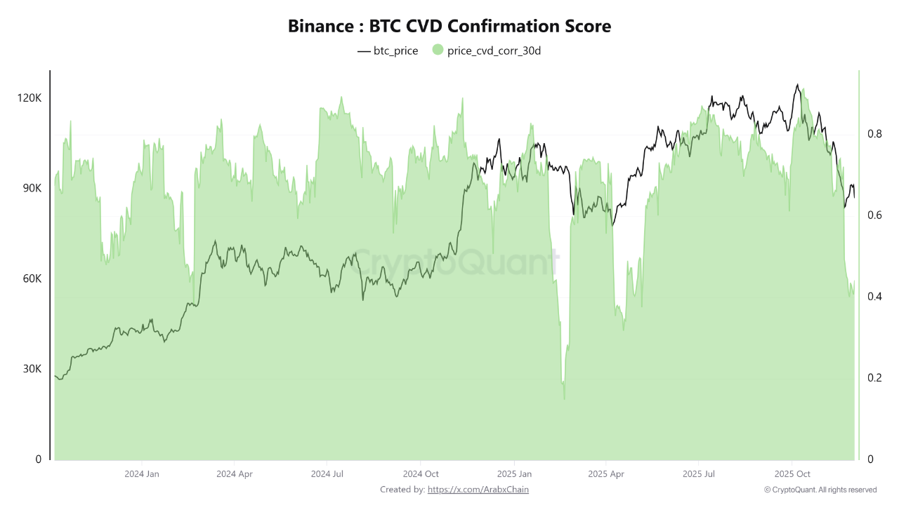 Arab Chain menjelaskan bahwa penurunan CVD Confirmation Score bukan sekadar variasi harian, tetapi mencerminkan melemahnya korelasi antara volume beli dan pergerakan harga Bitcoin.