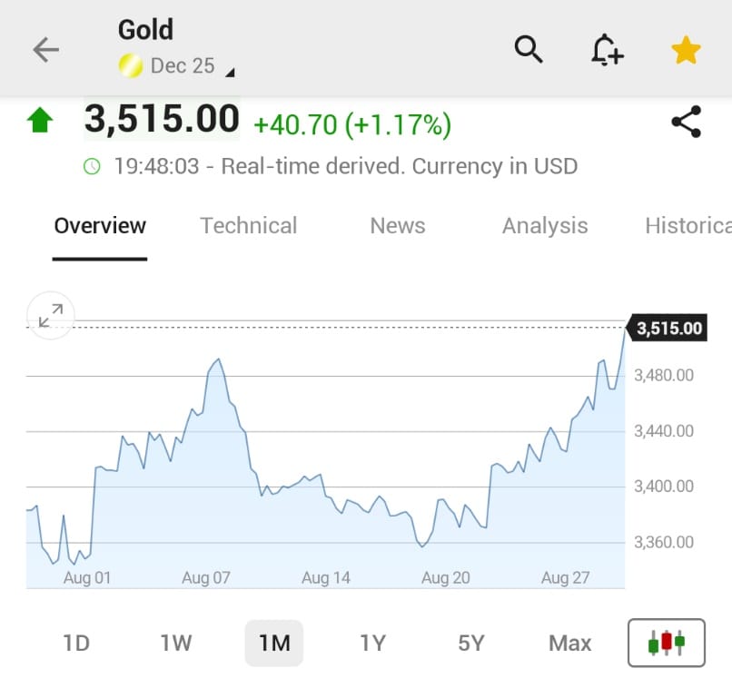 Menurut catatan pasar dari Bullion Vault, harga emas spot sempat bergerak di kisaran US$3.420–US$3.4490 pada sesi awal Jumat (29/8/2025), sementara kontrak berjangka Desember sempat menyentuh US$3.470 sebelum melejit hebat.