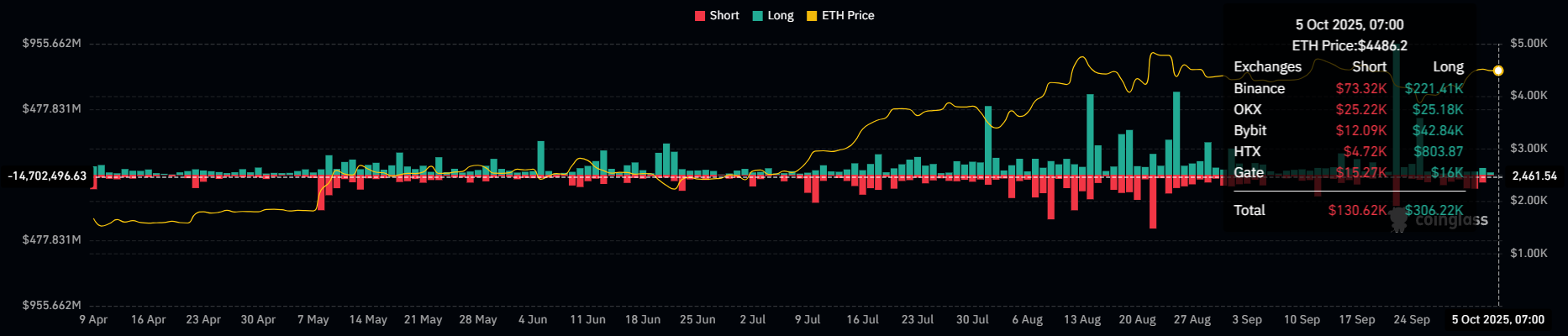 Kondisi volatil juga tercermin dari data likuidasi. Pada level US$4.486,2, total likuidasi tercatat mencapai US$436,84 ribu. Dari jumlah tersebut, posisi long mendominasi sebesar US$306,22 ribu, sementara short hanya mencapai US$130,62 ribu.