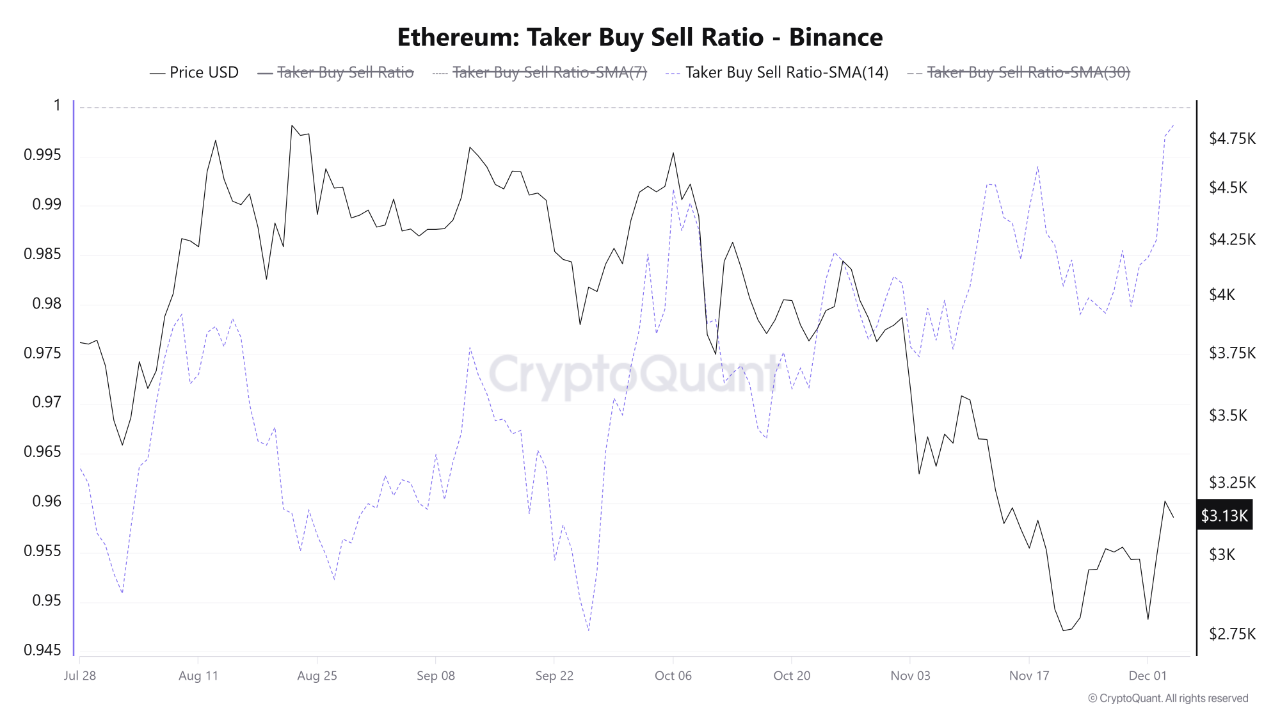 Data dari CryptoOnchain mencatat Taker Buy/Sell Ratio ETH di Binance melonjak ke 0,998, tertinggi sejak awal Agustus. Angka ini mencerminkan bahwa pembeli kembali mendominasi pasar futures dan bahwa sentimen bullish mulai pulih setelah koreksi pasar pada November.