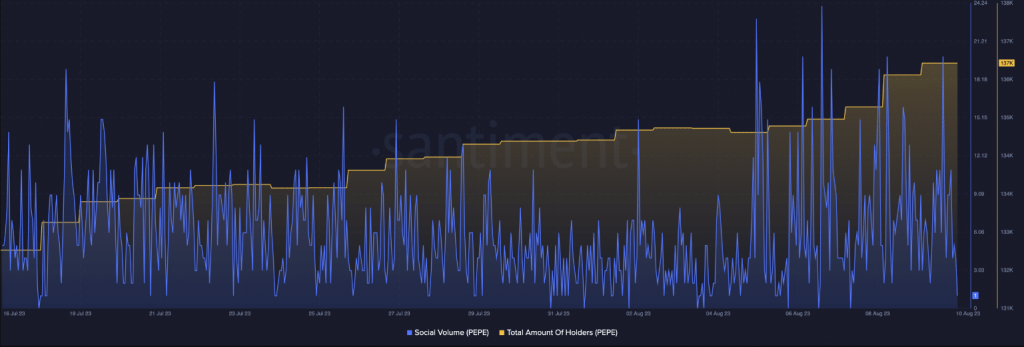 Analisis menyeluruh terhadap volume sosial PEPE selama sebulan terakhir mengungkap pola yang rumit. Popularitas token ini bergulir naik turun, menampilkan periode ketertarikan yang meningkat dan ketidakpedulian yang relatif.
