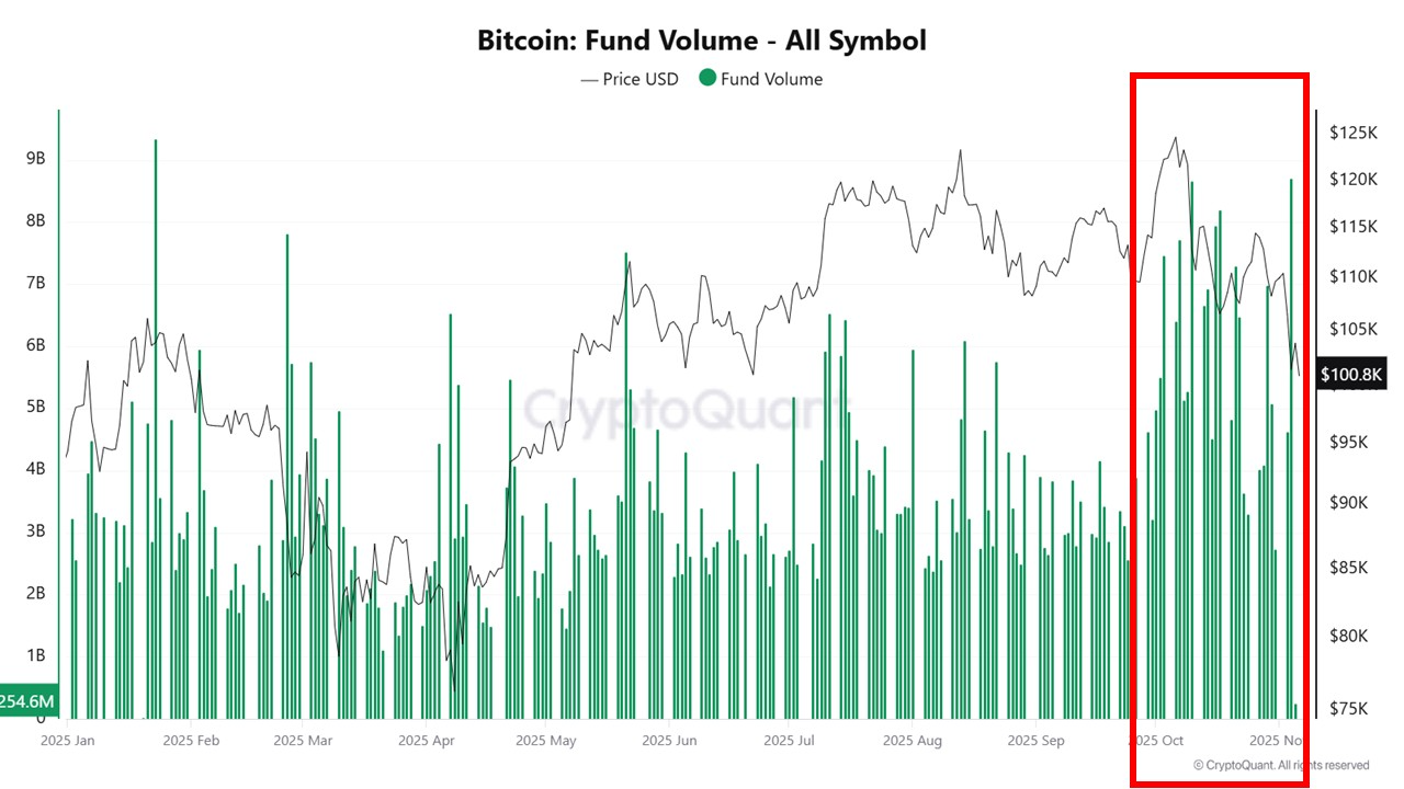 Selain peningkatan jumlah pasokan BTC yang mengalami kerugian, volume transaksi terkait dana investasi dan ETF juga meningkat tajam.