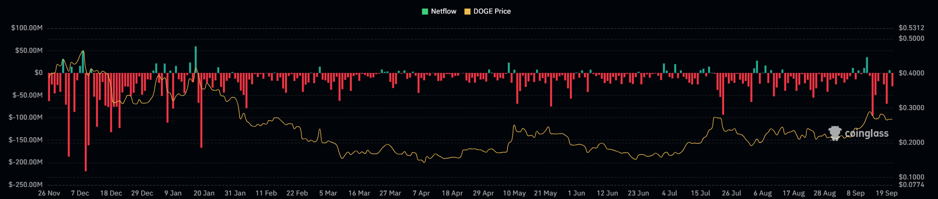 Di sisi spot, CoinGlass melaporkan bahwa DOGE mencatat netflow negatif sebesar US$29,65 juta pada harga US$0,26682. Arus keluar dalam jumlah besar dari bursa ini biasanya ditafsirkan sebagai langkah investor memindahkan aset ke dompet pribadi.