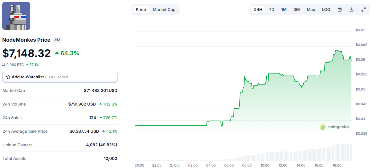 Berdasarkan data CoinGecko, reli tersebut juga mendorong kapitalisasi NodeMonkes ke level US$71,48 juta. Kenaikan ini sekaligus menandai momentum baru bagi salah satu koleksi NFT berbasis Bitcoin yang paling diperhatikan investor.