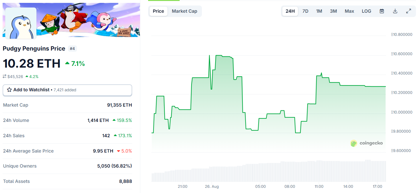 Berdasarkan data CoinGecko, harga floor Pudgy Penguins telah naik 7,1 persen menjadi 10,28 ETH atau sekitar US$45.526. Peningkatan ini mencerminkan minat pasar yang kembali menguat terhadap aset digital berbasis Ethereum tersebut, di tengah penurunan nilai pasar NFT secara keseluruhan.