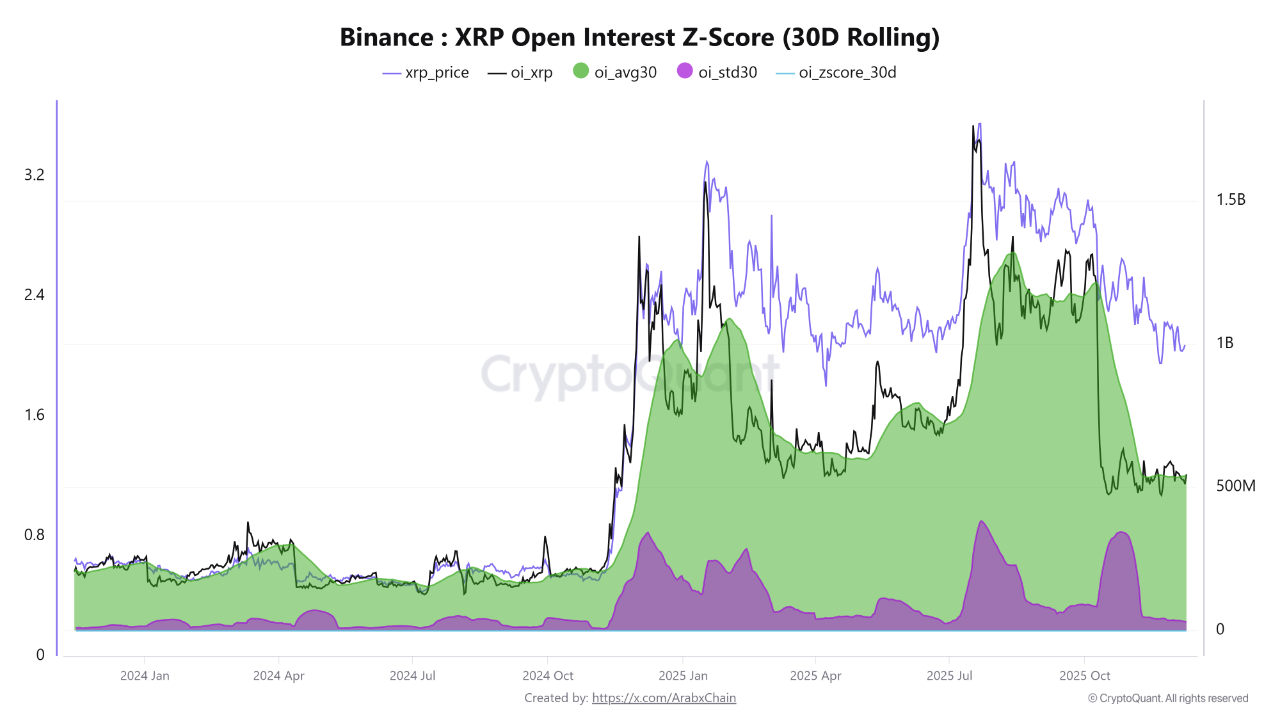 Pasar altcoin XRP memasuki fase tunggu, di mana data terbaru dari analis on-chain Arab Chain di CryptoQuant menunjukkan turunnya open interest (OI) di Binance sekaligus stabilnya indikator Z-Score pada level netral.