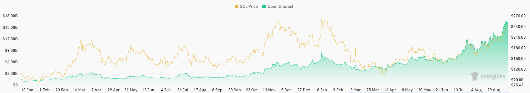 Data dari CoinGlass menunjukkan pasar derivatif Solana mengalami lonjakan aktivitas. Volume perdagangan harian naik 5,73 persen menjadi US$29,52 miliar, sementara open interest meningkat 0,25 persen ke posisi US$16,55 miliar.
