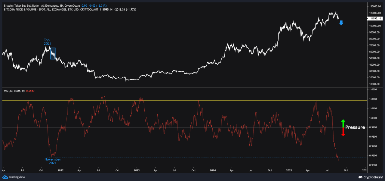 Indikator Taker Buy Sell Ratio Bitcoin mencatatkan nilai terendahnya sejak November 2021, tepat setelah harga Bitcoin kembali mencetak rekor tertinggi sepanjang masa.
