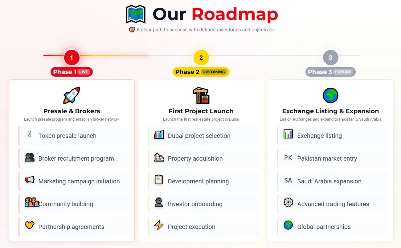 Roadmap RWAMP dimulai dari fase presale yang saat ini telah memasuki tahap kedua dengan bonus 10 persen. Tahap berikutnya mencakup pengembangan proyek properti di Dubai, mulai dari pemilihan aset hingga proses pembangunan.