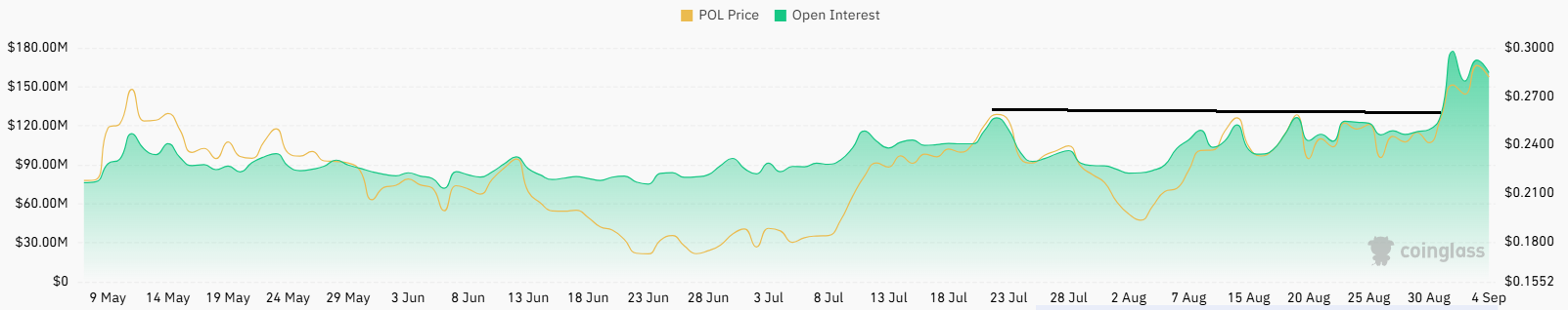 Berdasarkan data CoinGlass, volume perdagangan POL tercatat turun 25,94 persen menjadi US$202,11 juta. Namun, posisi kontrak berjangka (open interest) hanya melemah 2,15 persen menjadi US$163,84 juta, yang menunjukkan minat investor masih terjaga.