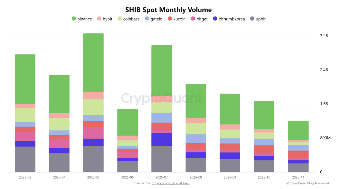 Aktivitas perdagangan meme coin Shiba Inu (SHIB) mengalami penurunan tajam pada November 2025, dengan total volume di bursa terpusat (CEX) hanya mencapai sekitar US$1,21 miliar.