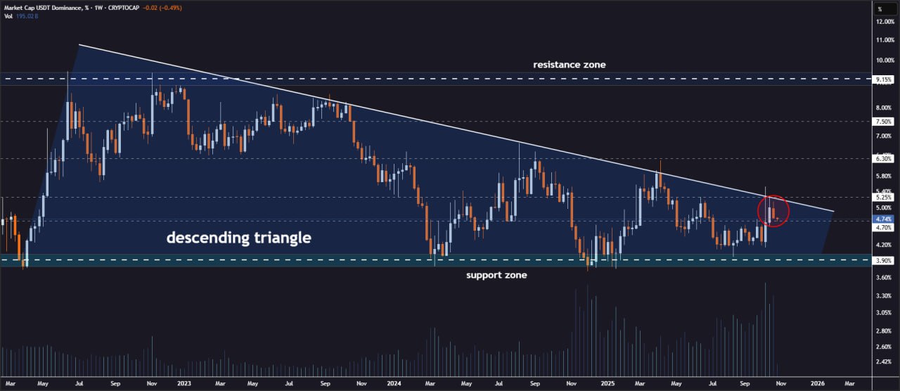 USDT Dominance telah memasuki fase teknikal yang menjadi perhatian analis setelah pergerakan grafik mingguan menunjukkan pola descending triangle yang dapat memengaruhi arah pasar kripto dalam beberapa minggu ke depan.