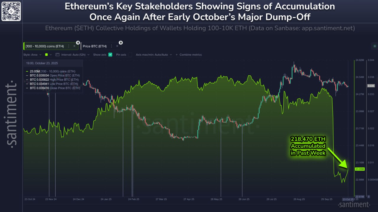Berdasarkan data on-chain dari platform analitik Santiment, para whale dan shark yang memegang antara 100 hingga 10.000 ETH telah mulai menambah kepemilikan setelah sebelumnya menjual sekitar 1,36 juta ETH pada periode 5 hingga 16 Oktober.